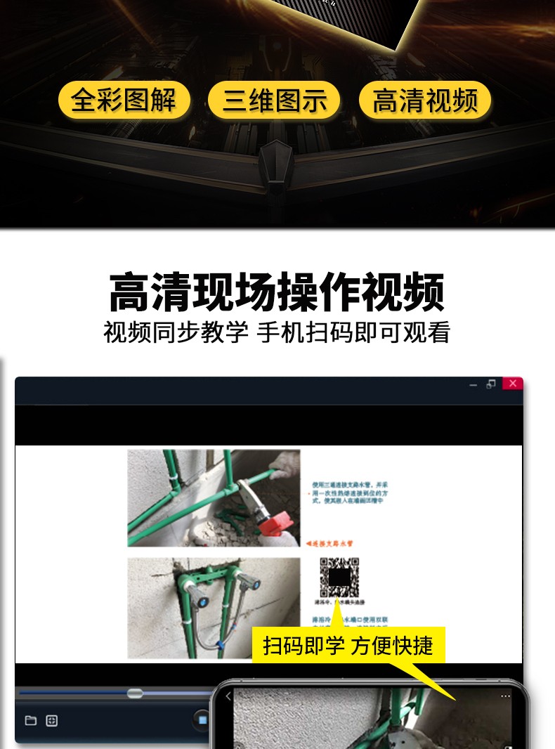 3.掃碼看現場高清視頻。重點水電施工步驟,配有高清現場施工視頻,觀看施工要點與細節,補充圖文講解的不足。