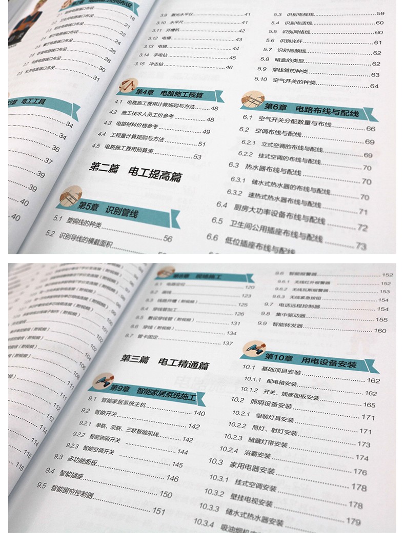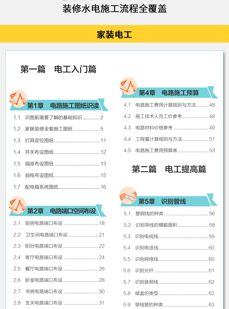 本書分為電工部分和水暖工部分,包含六篇、二十四章內容。電工部分主要介紹裝修電工施工。第一篇為電工入門篇,內容包括電路施工圖紙識讀、電路端口空間佈設、電路工具以及電路施工預算等;第二篇為電工提高篇,這部分為核心內容,包括識別管線、電路佈線與配線、電路接線以及現場施工等內容;第三篇為電工精通篇,內容包括智能家居系統施工、用電設備安裝、電路修繕以及家庭用電安全等。