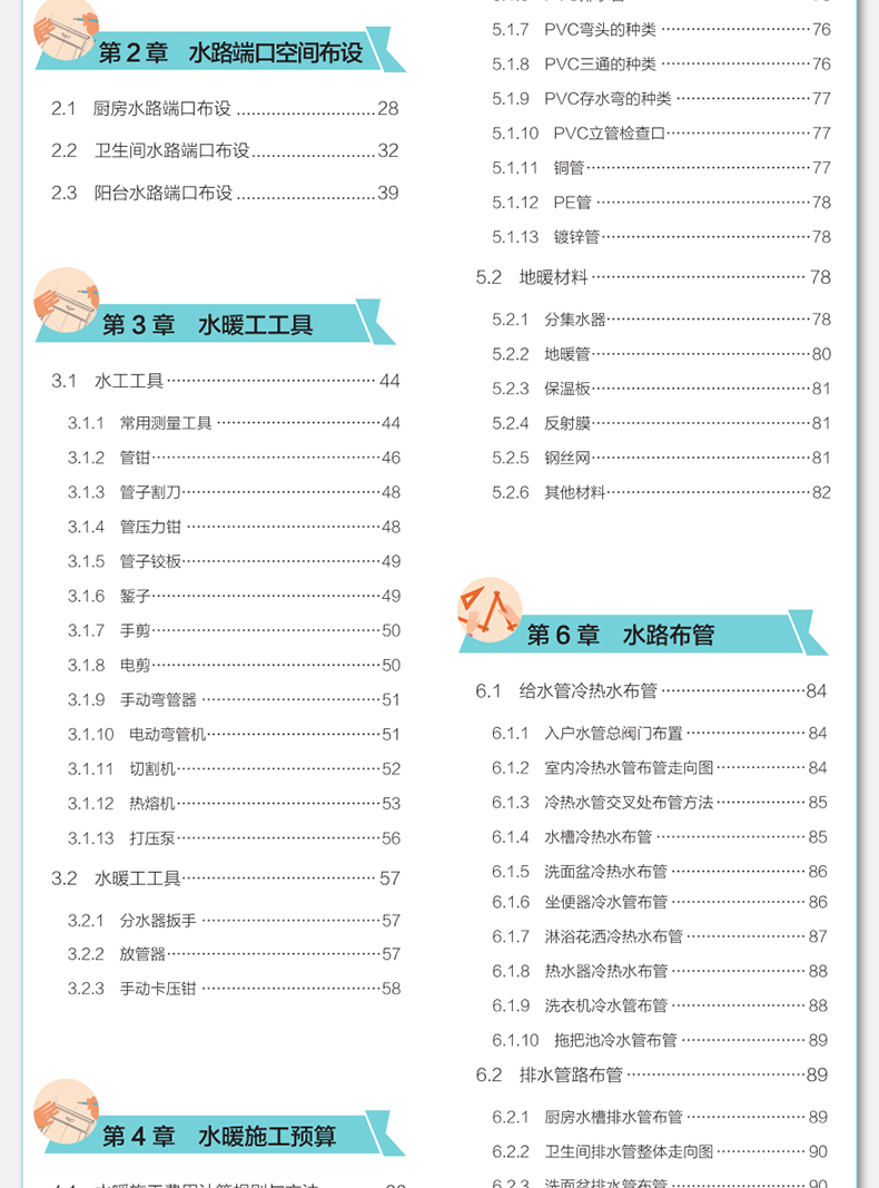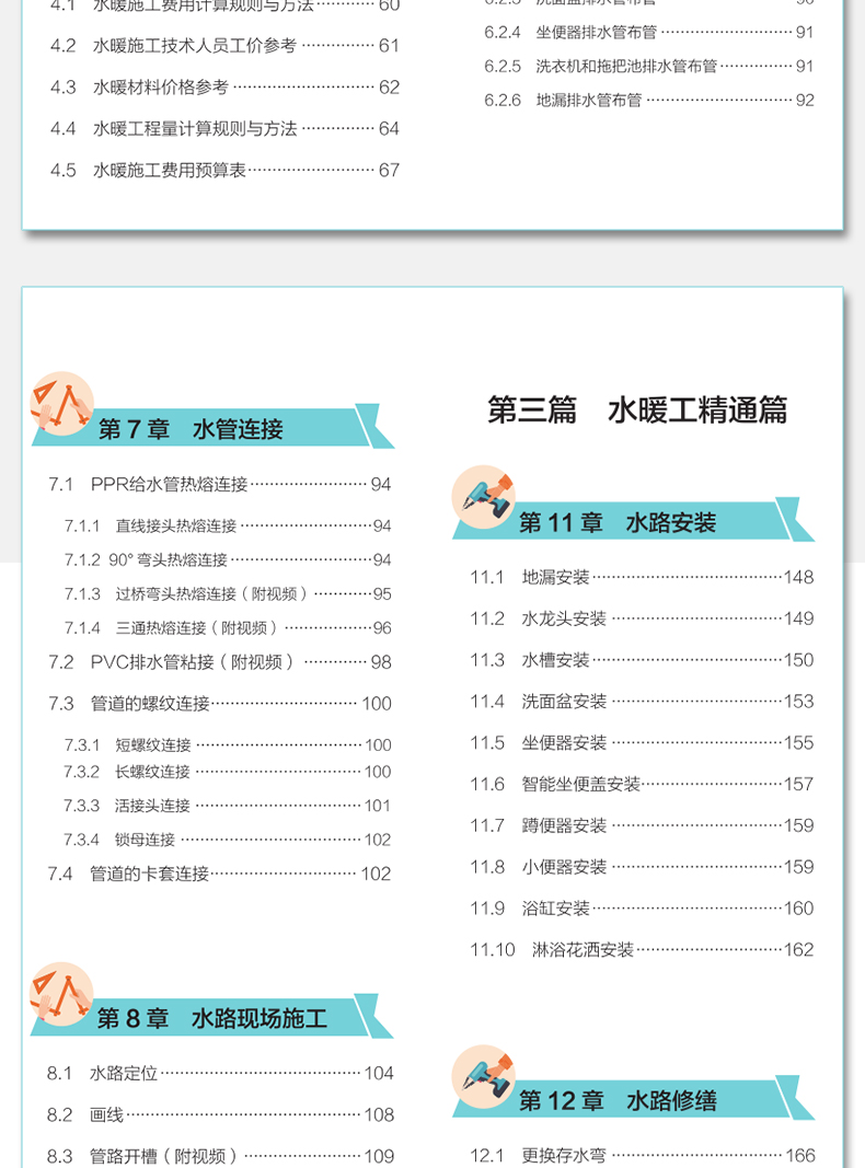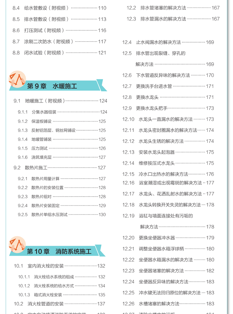 水暖工部分主要介紹裝修水暖施工。第一篇為水暖工入門篇,內容包括水路施工圖紙識讀、水路端口空間佈設、水暖工工具以及水暖施工預算等內容;第二篇為水暖工提高篇,內容包括識別材料、水路布管、水管連接、水路現場施工、水暖施工以及消防系統施工等內容;第三篇為水暖工精通篇,內容包括水路安裝以及水路修繕等內容。