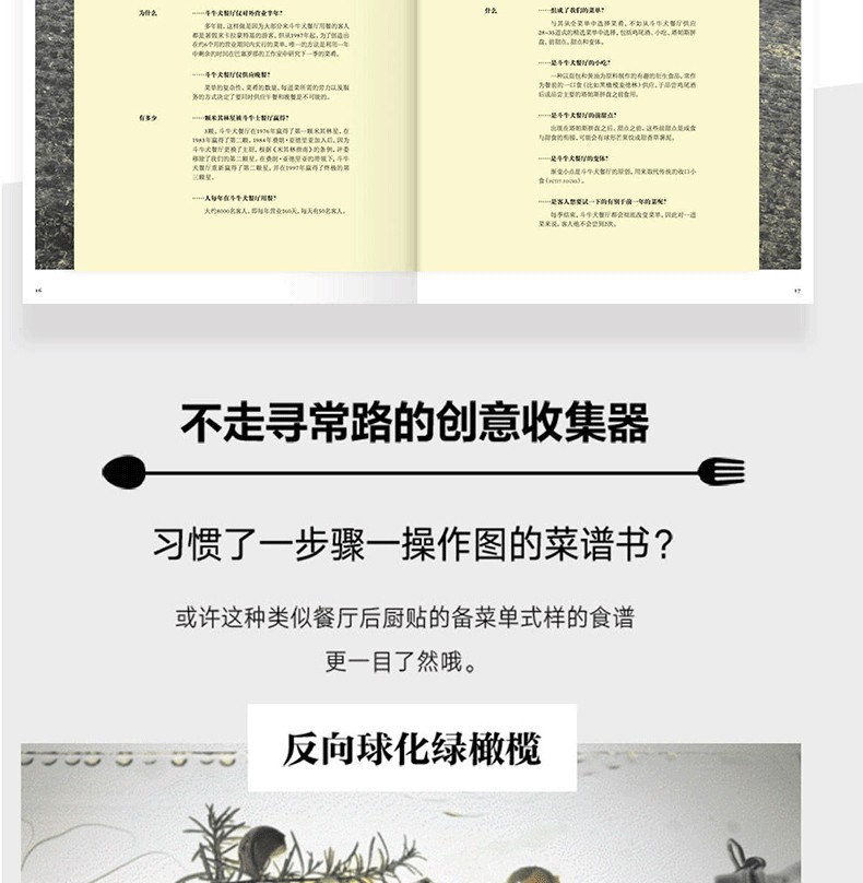 位於西班牙加泰隆尼亞玫瑰城的鬥牛犬餐廳以分子料理聞名於世,1961年開業,曾多次獲得米其林三星,並連續5年成為全球餐廳評選的榜首。這家餐廳每年接到超過200萬份預定請求,但由於其主要工作內容是菜餚創新,全年的開門迎客的時間只有160天,因此每年僅能招待約8000名食客,可謂一席難求,被追崇為“魔幻餐廳”。該餐廳於2011年歇業,隨後轉型為烹飪研究中心,延續其半世紀的輝煌。 《鬥牛犬餐廳的一天》向每位美食愛好者敞開了大門,以細膩的闡釋和壯觀的場景向讀者揭示這件傳奇餐廳內部運作,以及美食創意的奧秘。本書包含超過1000張精美照片,其中包括罕見的食譜和創意筆記,讓讀者一窺廚神團隊的創意方法和美食哲學,也看到這位烹飪大師的情感與內心。