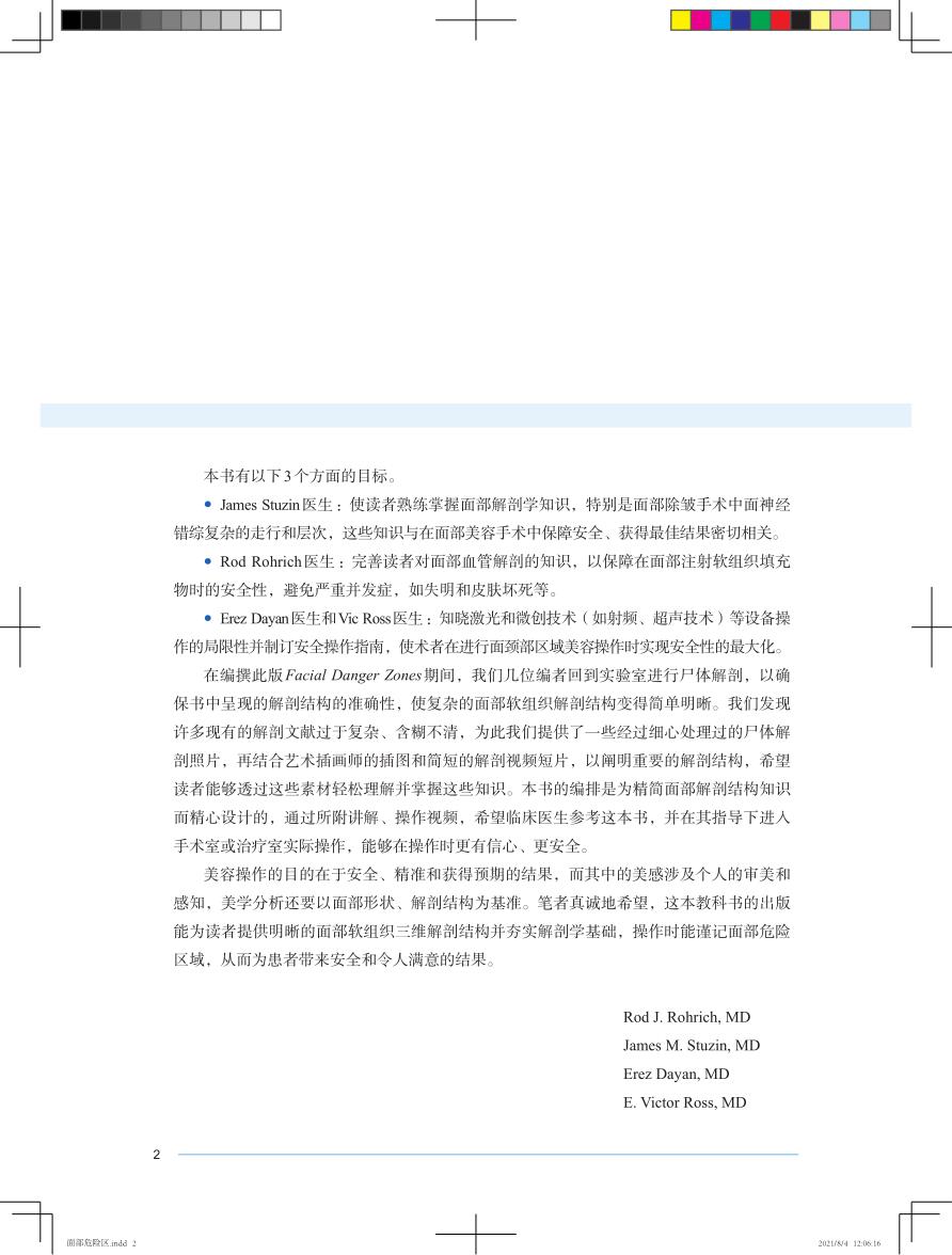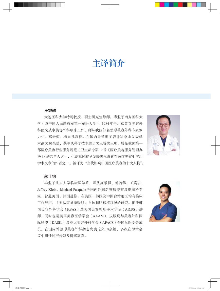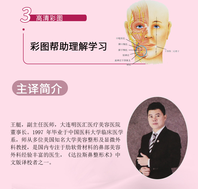 本書兼具先進性、科學性,可操作性強,是一本難得的優秀工具書。用言簡意賅的文字,配以清晰的屍體局部解剖照片、精美的藝術細節插圖及解剖短視頻,幫助讀者更易理解、記憶和掌握相應的解剖結構和層次。本書對於美容外科醫生,在美容外科手術操作中,特別是在面頸部除皺術中,可自信從容地避免面部運動神經及重要血管的損傷,提升手術的預期效果 ;對於專注於面部微整形和注射填充的醫生,可以更有效地避免嚴重並發症的發生,包括失明和皮膚壞死等 ;對於光電皮膚美容醫生,可在面頸部操作上實現安全性的化。