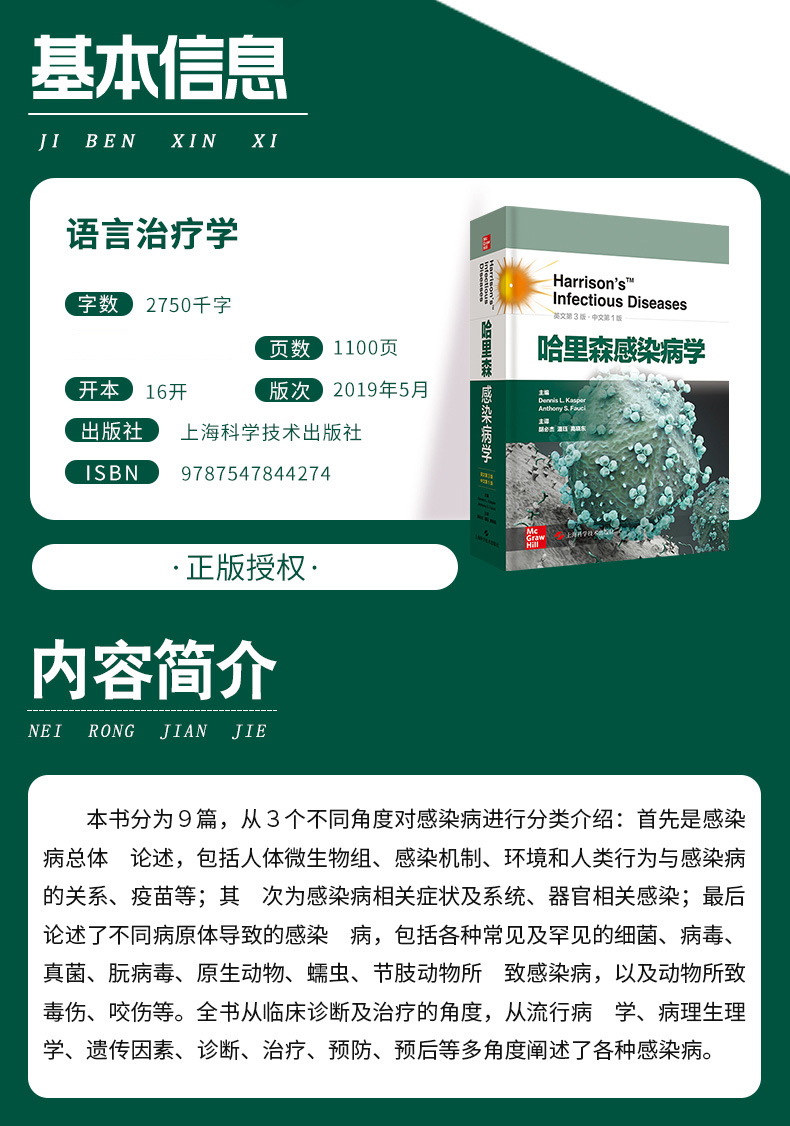 《哈里森感染病學》譯自在全球醫學界享有盛譽的哈里森醫學系列之感染病學分冊Harrison's Infectious Diseases(3rd edition),原著由Dennis L. Kasper教授、Anthony S. Fauci博士主編,197位感染病學及微生物學、免疫學等感染病學相關領域知名專家共同編寫。