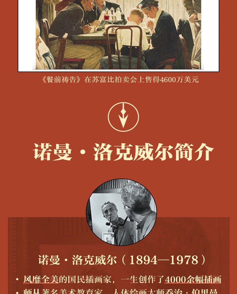 諾曼·洛克威爾(1894—1978),美國傳奇插畫大師,師從·伯里曼,因生動描繪國家風土人物獲美國平民最高榮譽“總統自由勛章”,被《紐約時報》譽為“20世紀美國最受歡迎的藝術家”。洛克威爾也深受邁克爾·傑克遜、史蒂文·斯皮爾伯格、喬治·盧卡斯等藝術家喜愛,對他們的藝術創作產生了深遠影響。