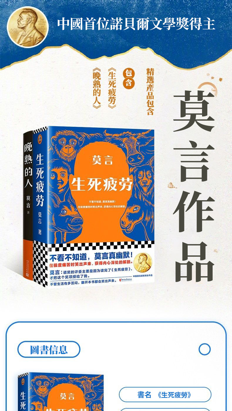 【全台免運 】中國首位諾貝爾文學獎莫言代表作《生死疲勞》+《晚熟的人》精裝紀念版共冊本,飽含著對人的命運的深深關懷和憐憫,用幽默語言寫盡人生百態