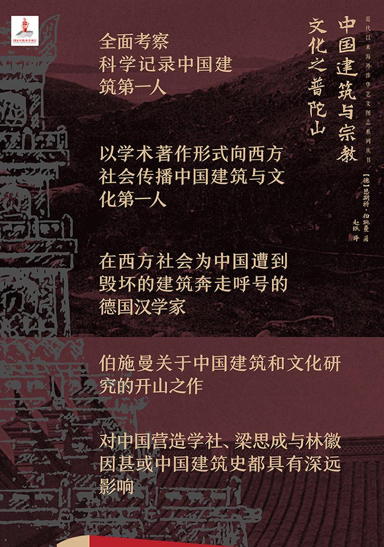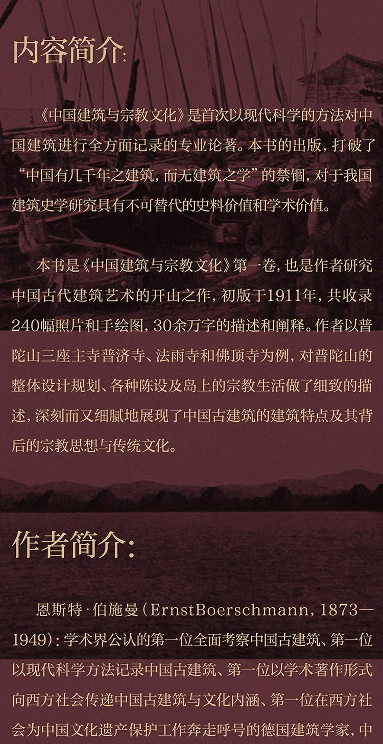 本書是《中國建築與宗教文化》第一卷,也是作者研究中國古代建築藝術的開山之作,初版於1911年,共收錄240幅照片和手繪圖,30餘萬字的描述和闡釋。作者以普陀山三座主寺普濟寺、法雨寺和佛頂寺為例,對普陀山的整體設計規劃、各種陳設及島上的宗教生活做了細緻的描述,深刻而又細膩地展現了中國古建築的建築特點及其背後的宗教思想與傳統文化。