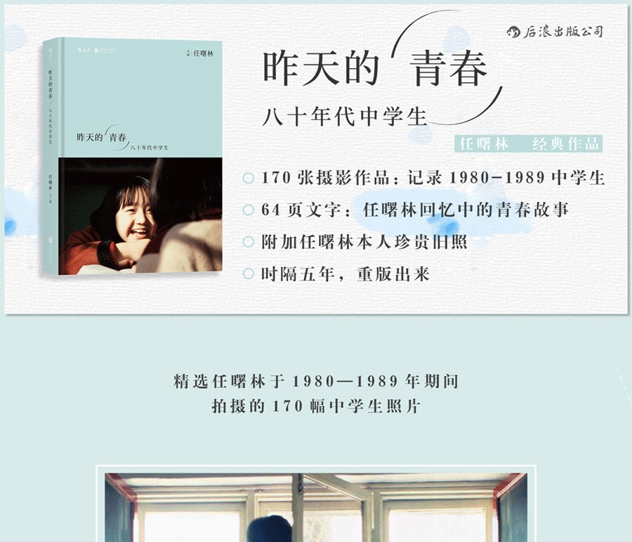 《昨天的青春:八十年代中學生》精選了任曙林在1980—1989年期間拍攝的170幅中學生照片。這十年間他進入中學校園,旁觀中學生的課堂和課餘生活,觀察他們的動作、神情、關係,揣摩他們的心思,用溫柔抒情的鏡頭語言記錄下那一代人的青春。