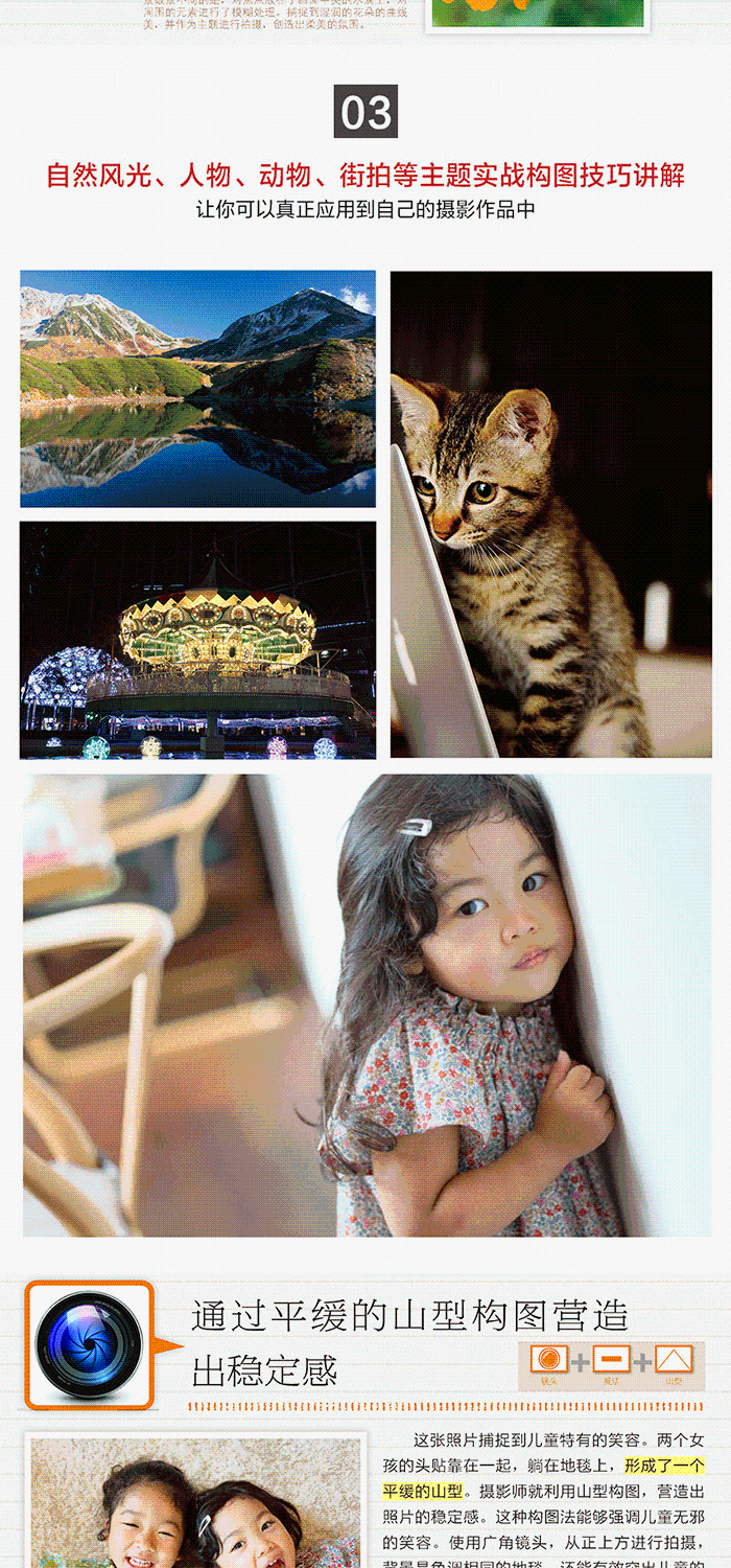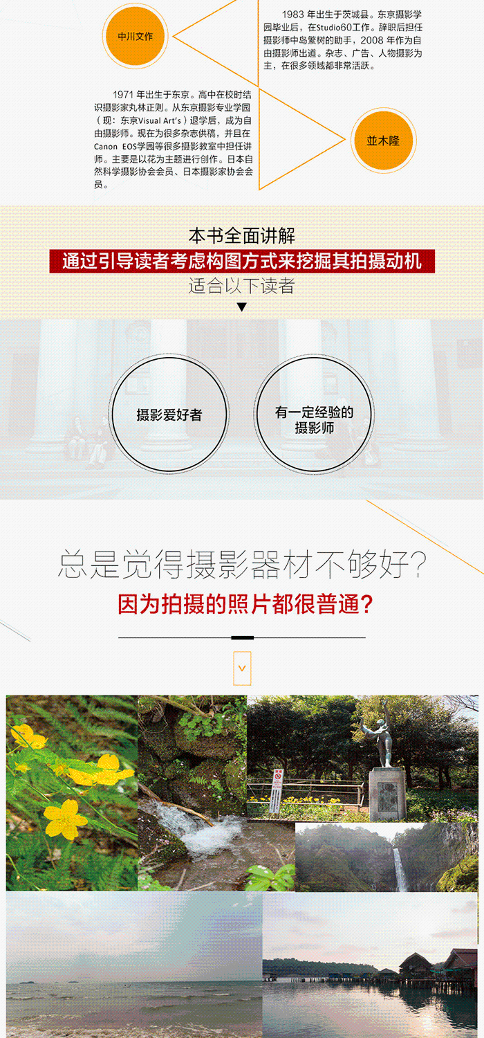 上田晃司(うえだ·こうじ):留學美國舊金山學習攝影及攝像的同時,參與過電視節目、CM和視頻的製作。回國後擔任攝影家塙真一的助手,後作為自由攝影師出道。以為雜誌撰稿、拍攝廣告照片為主。將在SJ各地拍攝作為畢生事業。近年還舉辦演講並開始著書。 Nikon College講師。河野鐵平(こうの·てっぺい):1976年出生於東京。明治學院大學畢業後,師從攝影師TERAUCHI MASATO。參與寫真雜誌《PHaT PHOTO》的創刊。 2003年D立工作。著作有《享受相機和攝影的**佳教科書》(MdN)、《時尚照片的拍攝教程》(玄光社MOOK)等。杉本恭子(すぎもと·きょうこ):出生於東京,原來在大型IT企業擔任系統工程師,之後師從攝影家竹內敏信。作品入選很多攝影比賽,經常被報紙和雜誌採用。近年的著作有《我的攝影入門》(文藝社Visual Art)。 **近在東京和名古屋多次開辦攝影教室和攝影交流會。日本攝影師協會會員。日本攝影協會會員。日本攝影治愈法協會理事。種清豐(たねきよ·ゆたか):1982 年出生於大阪。從京都產業大學外國語學部德語專業畢業後,師從攝影家竹內敏信。擔任了3年助手後,2007 年開始作為自由攝影師出道。在寫真教室授課以及進行商品攝影、在專業攝影雜誌、網絡上刊登照片有關的文章。 CaDn EOS 學園講師。 NPO法人 PCC俱樂部講師。日本攝影學院講師。中川文作(なかがわ· ぶんさく):1983 年出生於茨城縣。東京攝影學園畢業後,在Studio 60 工作。辭職後擔任攝影師中島繁樹的助手,2008 年作為自由攝影師出道。雜誌、廣告、人物攝影為主,在很多領域都FC活躍。並木隆(なみき· たかし):1971 年出生於東京。高中在校時結識攝影家丸林正則。從東京攝影專業學園(現:東京Visual Art’s)退學後,成為自由攝影師。現在為很多雜誌供稿,並且在CaDn EOS學園等很多攝影教室中擔任講師。主要是以花為主題進行創作。日本自然科學攝影協會會員、日本攝影家協會會員。