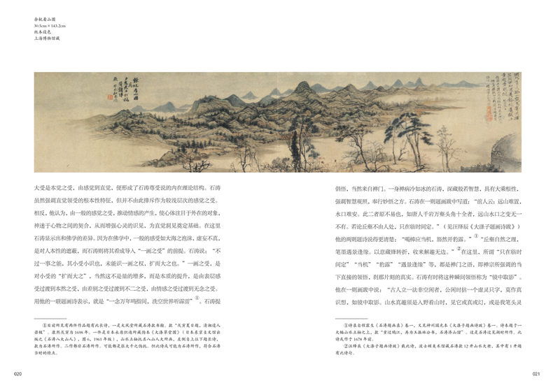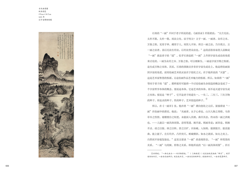 石濤是傳統藝術後期發展中卓具創造精神的理論家,《石濤畫語錄》可謂中國傳統藝術哲學的壓卷奇作。石濤論畫以“一畫”為中心,“一畫”是天地賦予人的生命創造精神,蕩去一切遮蔽,將人的創造力釋放出來。石濤說,“法自畫生”,法,不自古人生,不自山川外在面貌起,自我的心中出,在我此時此刻作畫時的筆下流出。它所表現的就是石濤至人無法,非無法也,無法而法,是為我法的創造原則。