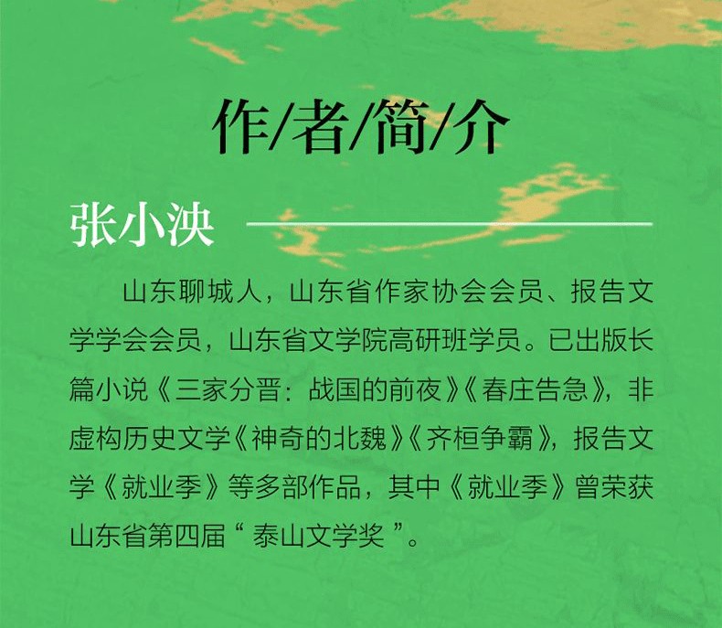 "張小泱 山東聊城人,山東省作家協會會員、報告文學學會會員,山東省文學院高研班學員。已出版長篇小說《三家分晉:戰國的前夜》《春莊告急》,非虛構歷史文學《神奇的北魏》《齊桓爭霸》,報告文學《就業季》等多部作品,其中《就業季》曾榮獲山東省第四屆“泰山文學獎”。"