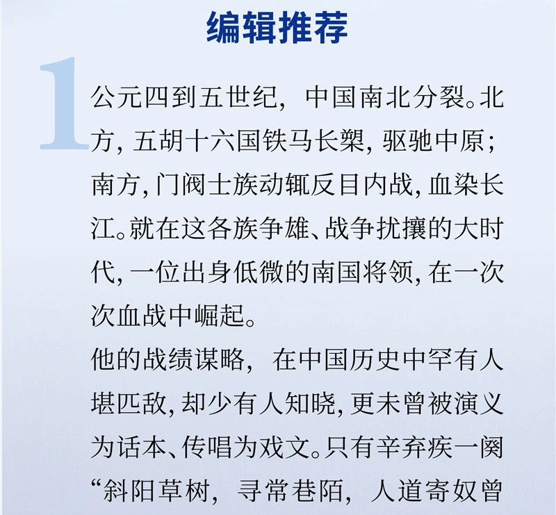 在歷代的王侯將相當中,劉裕的聲望和影響並不十分突出,但他的戰績謀略,在中國歷史中卻罕有人與其匹敵——他出身低微,憑實力在一次次血戰中崛起,兩個北方政權、兩個江南王朝、若干割據勢力,先後覆亡在他腳下;他終結了江南士族百年共和政治,建立起血腥、高效的軍人政權——而且從戰爭的緊張程度、從實力與戰績的“相對值”來看,劉裕戰史的精彩度,不亞於橫掃亞歐大陸的成吉思汗。本書作者以細膩的文筆,書寫了劉裕一生跌宕傳奇的戰爭生涯,同時在寫法上進行了若干有意識的探索。