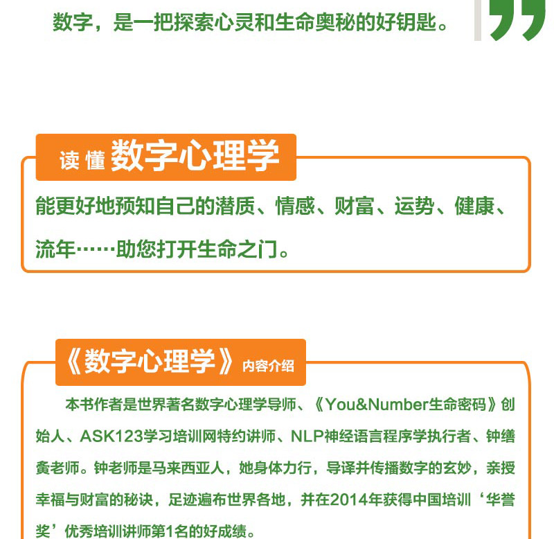 世界著名數字心理學導師,《You&Number生命密碼》創始人鐘繕夤(馬來西亞),她編著的《數字心理學》為我們提供了一套有趣易學易用的數字心理學理論,解開生命的密碼。人的一生都與數字有著千絲萬縷的聯繫,在眾多的號碼中,對人具有根深蒂固影響作用的就是生日。讀懂數字心理學,能更好地預知自己的潛質、情感、財富、運勢、健康、流年等,幫你打開生命之門。