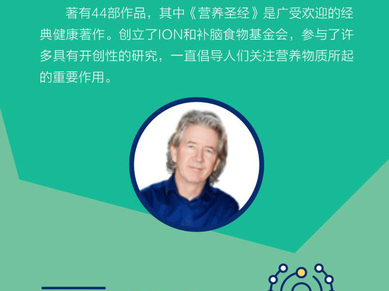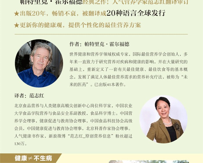 帕特里克·霍爾福德,世界健康和營養學領域代表專家,靠前營養學會創始人,曾師從專享兩度獨自獲得諾貝爾獎的天才學者萊納斯·鮑林。 30多年來,他一直致力於研究營養對病痛和健康的影響,並在大量研究的基礎上,重新定義了一套有關健康飲食的基本概念,發展了滿足人體營養需求的營養補充療法。 1997年,帕特里克·霍爾福德基於營養學會20多年的研究成果,出版了《營養聖經》,該書獲得廣泛好評,並登上歐美各國的暢銷書排行榜,成為備受歡迎的經典健康著作之一,現已被譯成20種語言發行。