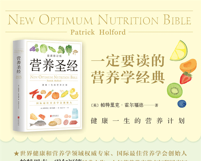 帕特里克·霍爾福德是靠前營養學會的創始人。 《營養聖經(很新修訂版)(精)》是他根據多年研究成果撰寫的營養學普及讀物,以通俗易懂的語言介紹了每個人都應該了解的營養學知識,並針對不同年齡,不同體質的人群提出了改善飲食的可行性建議。對預防病痛,提高免疫力,擺脫抑鬱、失眠等亞健康狀態等有直接幫助。