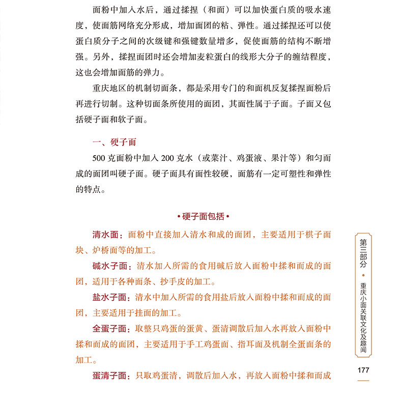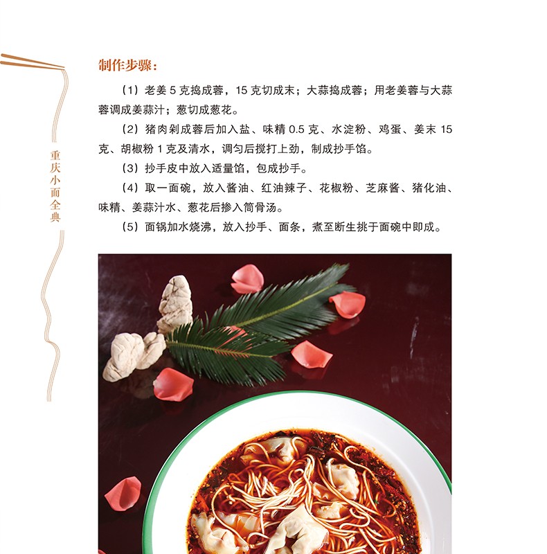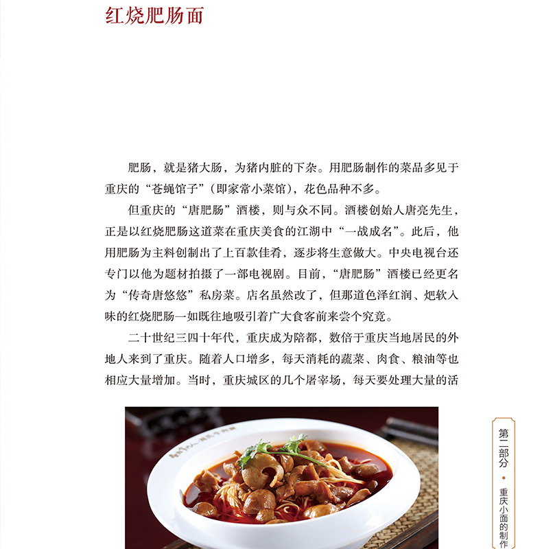 移民使麵條成為重慶人的主食。本書詳細介紹了目前能夠吃到的重慶小面所有品種(包括35種臊子麵及17種特色面)的製作技術和文化歷史背景,著重介紹了重慶小面使用的調料種類及其加工技術、鮮湯的吊制技術、油脂的熬製技術等最影響風味的幾個方面,書中還收集和整理了歷史上各個時期與重慶小面有關的知識,同時收集了部分食客對重慶小面這張“城市名片”的評價文章。