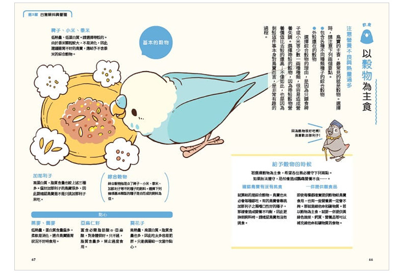 日常照料:每天的飲食、打掃鳥籠、幫鳥寶洗澡或日光浴的方法、修整趾甲等。