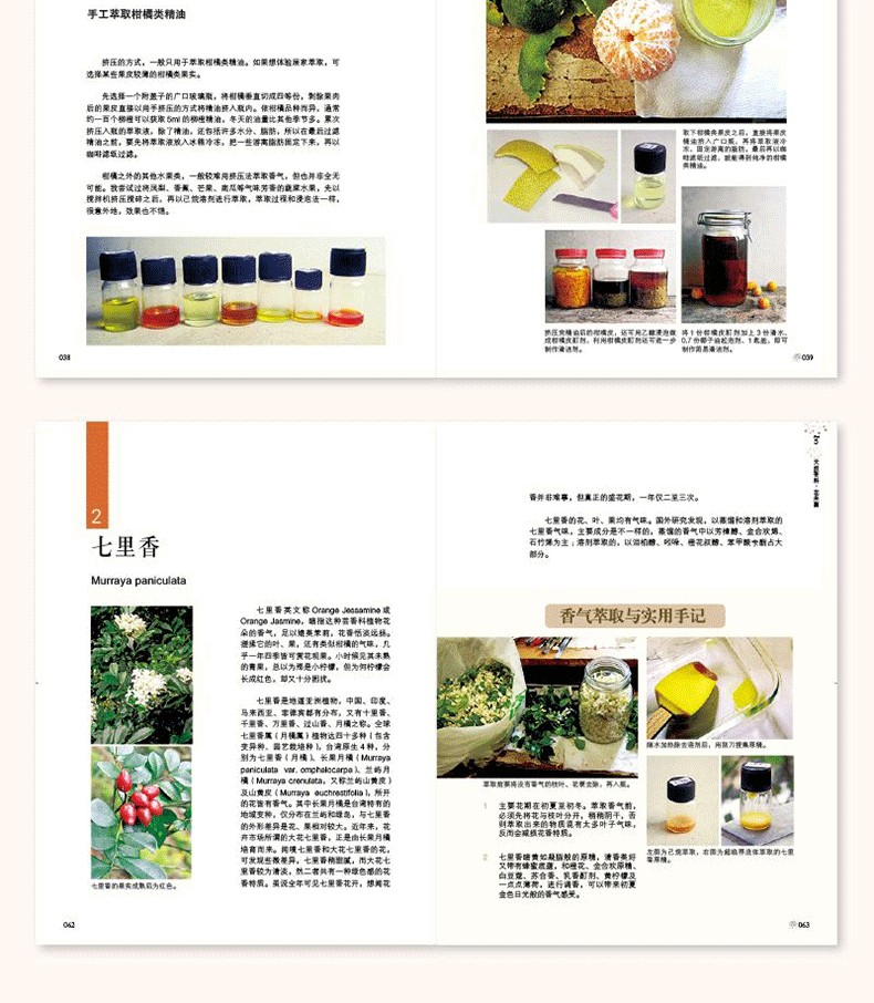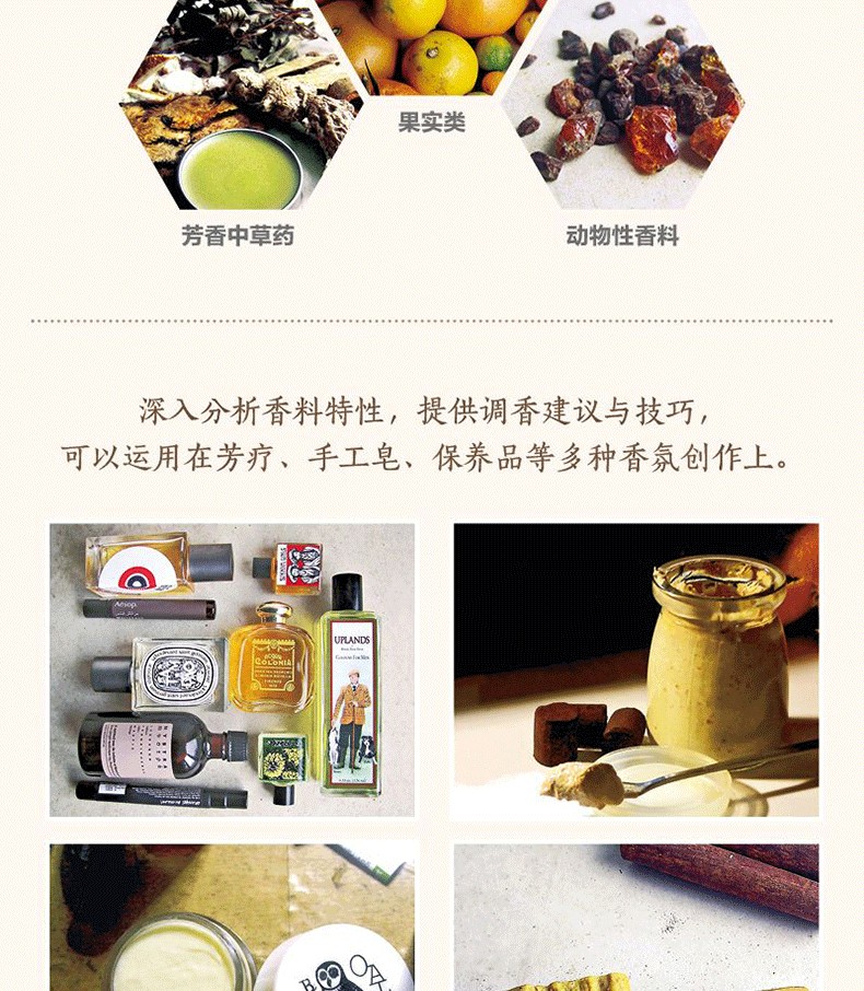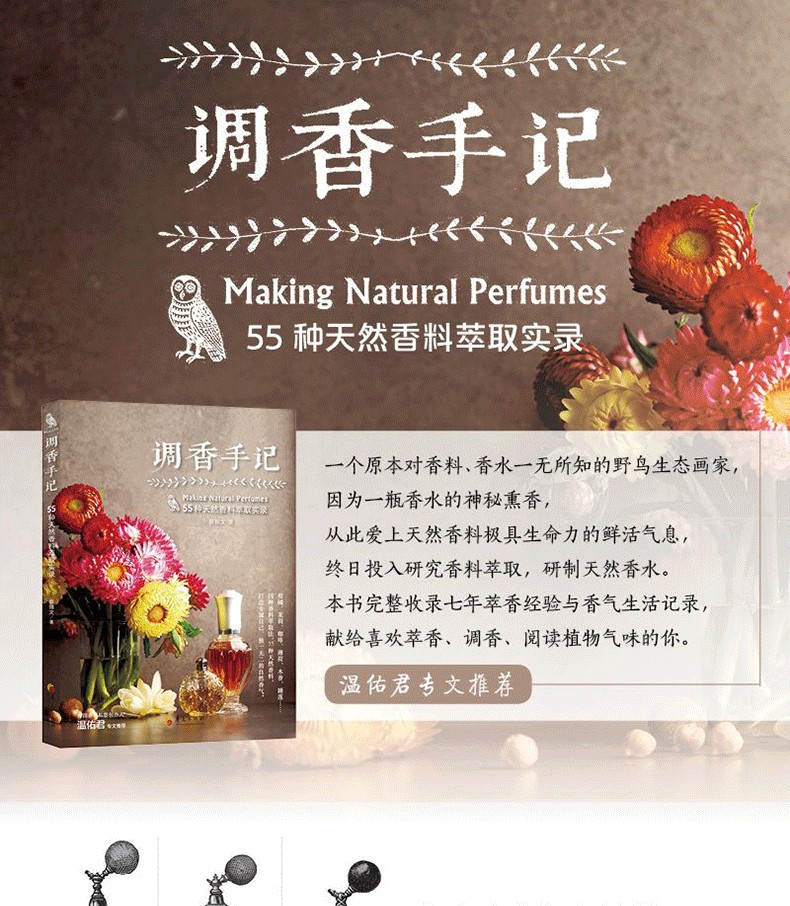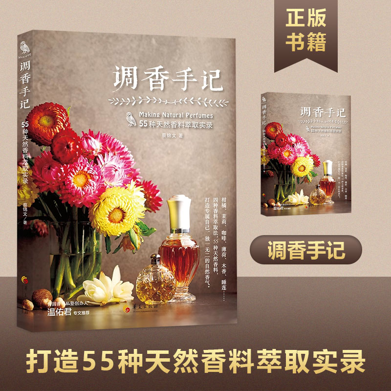 《調香手記:55種天然香料萃取實錄》圖解四種香料萃取方法(合香、浸泡、擠壓、脂吸),從五大類(花朵、果實、草葉、芳香中草藥、動物性香料)入手,細說55種天然香料的色與萃取過程,提供調香建議與技巧,無需昂貴設備就能提取原精,調配香水。