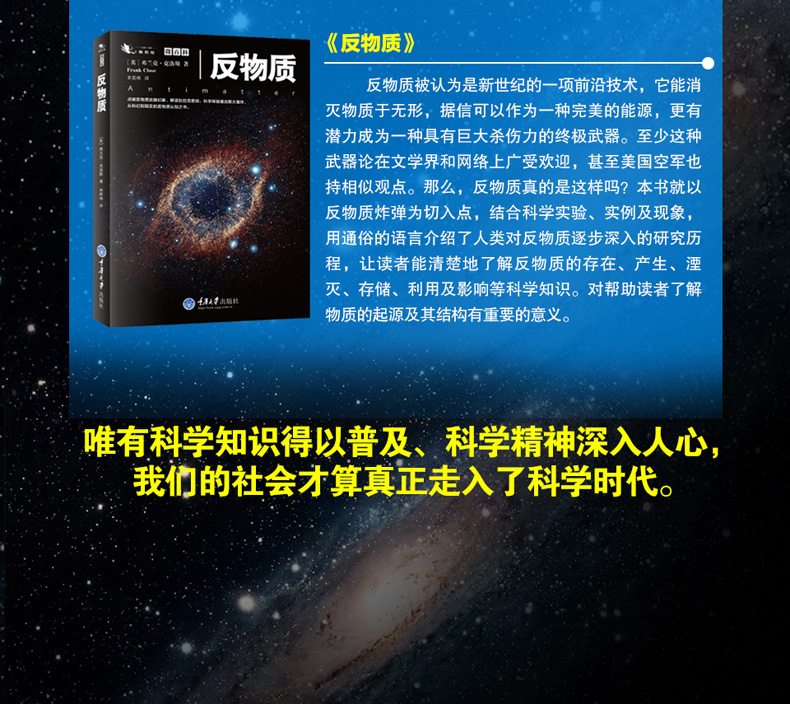 《反物質》是一本語言通俗的、從科幻切入現實的反物質認知之書。克洛斯為讀者解讀狄拉克密碼,釋疑通古斯大爆炸,剖析反物質武器迷霧,