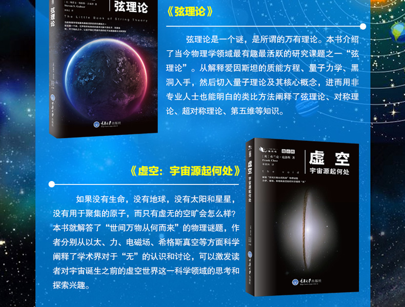 《虛空》:世間萬物從何而來?時間和空間是如何從無到有的?假設我們從一個空間範圍內移走了所有的物質,那麼這個空間會回到原初的“無”的狀態嗎?真空是真的空嗎?學術界關於“無”的認識和討論經歷了哪些變革呢?波、電磁場、以太、相和組織、力和希格斯真空等眾多重要物理概念的出現又帶來哪些突破性意義? 《虛空》將打開一扇宇宙中的虛空之門,由淺入深帶領讀者進入玄妙的虛空世界。