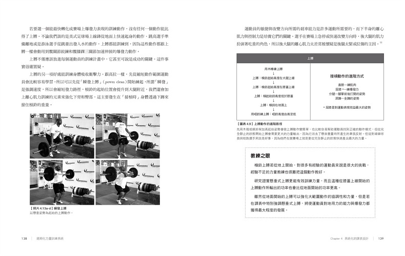 本書的這套課表系統將帶你深入了解設計一份優質的力量課表應該具備的技術性知識,包括動作選擇、訓練順序以及訓練量的增減等,教你如何建立有效、彈性、長期且個人化的訓練計畫。此外,由於使用這套系統也須仰賴教練或運動員的直覺,才能機動地調整動作難度與訓練量,書中各章節的「教練之眼」將提點你身為一位教練或運動員應該在訓練中註意哪些地方,才能在追求訓練目標的同時避免過度訓練。
