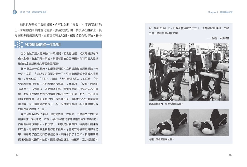我為了參加男性五十歲體能比賽而接觸本書,執行十二週後瘦了27公斤。最後,我在男子公開賽新手組得到第五名,更棒的是訓練的過程中,我的肌耐力進步神速。臥推從85增加到135公斤,負重深蹲、硬舉和過頭推舉也都有明顯的進步。