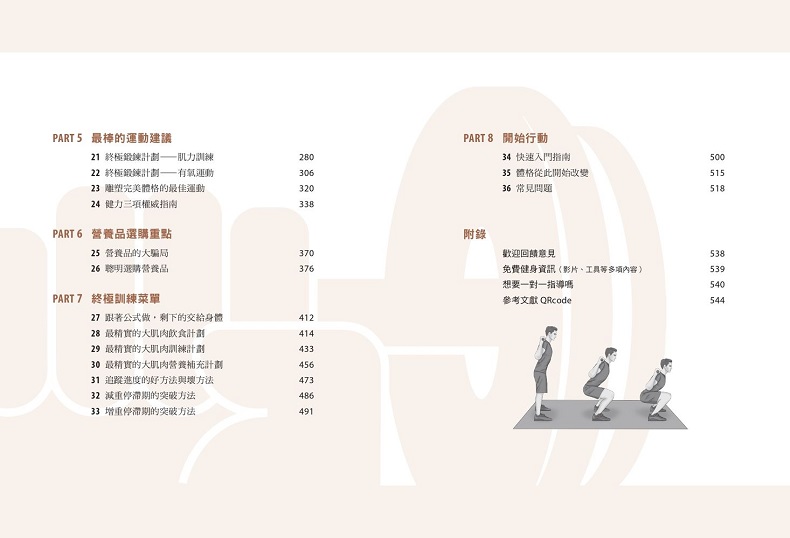 本書介紹了正確的飲食方式、運動觀念和訓練方法,除了能鍛鍊出強壯健康的身心,同時也能獲得良好健美的體態。 ——吳肇基(骨科專科醫師、臉書粉絲專頁「大夫訓練」編輯)