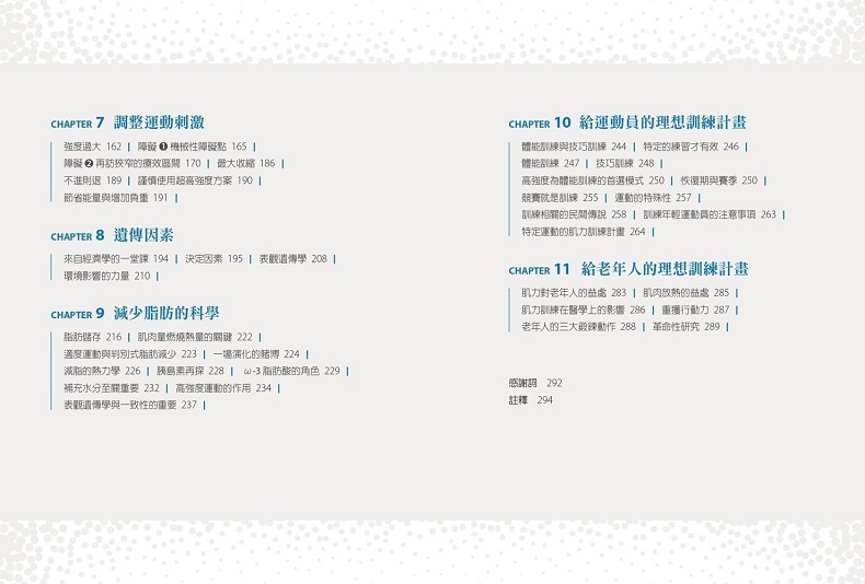 肌肉如何決定體格的形狀和外觀?怎麼樣的負重訓練可以長肌肉?每日的訓練時間有限,如何設定一套不做白工的訓練方法、獲得最大功效?這本書都將告訴你。 --《肌力訓練聖經》作者 馬克.銳普托