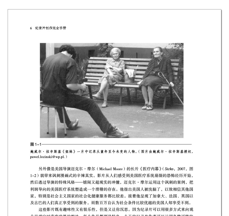 \\\"第1章 導演的角色 1.1? 誰有興趣拍紀錄片 走進任何一個紀錄片影展,你會看到各種不同的導演—年老的、年輕的、害羞的、直率的、心事重重的、內向的、外向的、身材高大的與嬌小的,他們大部分友善、謙遜而且容易親近。他們透過自己的影片來訴說深刻的事情,同時保持著謙和和真誠,跟他們在一起你感覺舒適自然。他們的作品,無論長短,都帶著你走上一段你所不知或者沒有預期的神秘旅程。例如波蘭導演鮑威爾?拉辛斯基(Pawel?Lazinski)的12分鐘片子《姐妹》(The Sister,1999,圖1-1),只不過拍攝了一對老姐妹在天井長凳上的爭吵過程,那個姐姐要妹妹去走走,讓人工髖關節活動一下,但每次妹妹總是微笑著迴避。兩人每次抱怨對方時都很有心機地向著攝影機說話,老姐姐說爸媽太寵妹妹讓她懶慣了,妹妹則說姐姐一直對她頤指氣使。這部片子以一種深刻的真實觸動了你:手足之間始終如一,爭吵如同每日必做的儀式不可或缺,但是時光不留人。其中一人可能瞬即離世,兩人以吵吵鬧鬧互相安慰的一生也將走向寂靜。