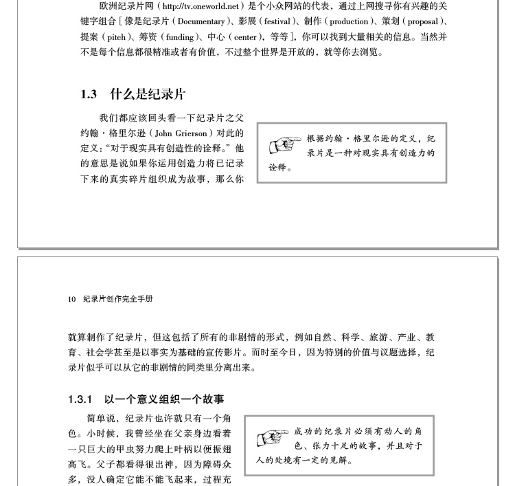 《紀錄片創作完全手冊》是業界公認的經典教材,系統展示了國際通行的紀錄片創作全流程,大到籌資企劃、組建團隊、參加電影節,小到租賃設備註意事項、拍攝計劃進度日程的細節安排——紀錄片創作者關心的所有問題,都能在本書中找到答案。 《紀錄片創作wan全手冊》既提供提綱挈領的理論指導,也有豐富的實戰技巧經驗分享;既有對紀錄片理念美學的思考,又有詳細的技術講解,是一部百科全書式的紀錄片實戰*經。