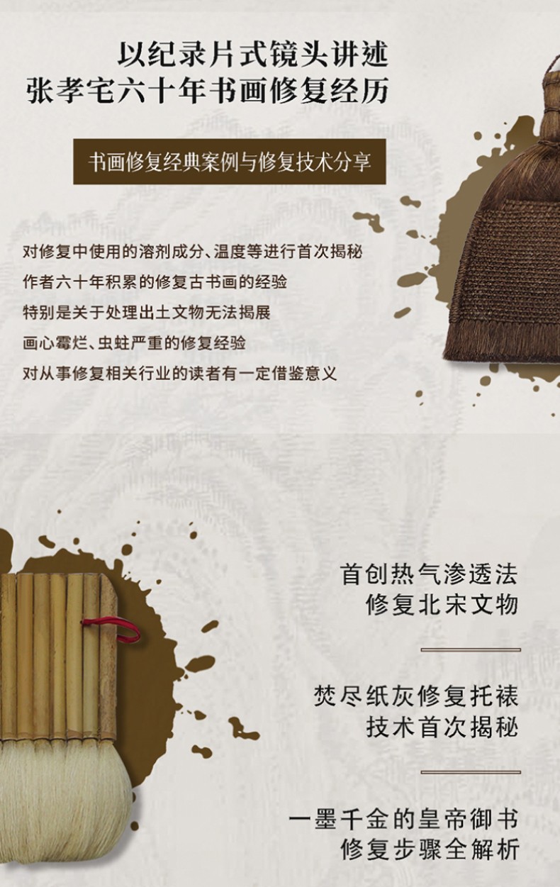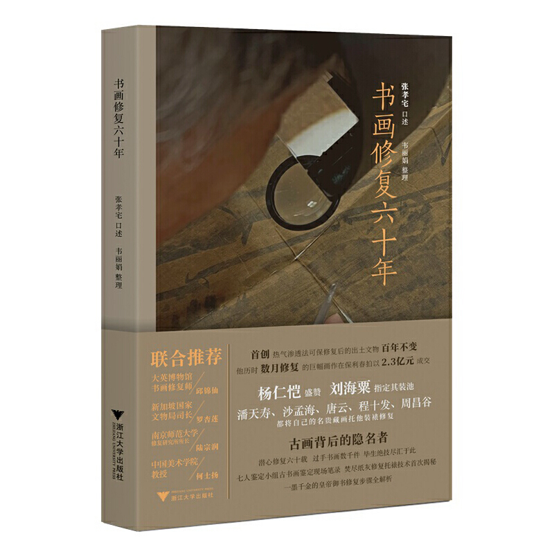 《書畫修復六十年》一書,講述張孝宅先生古書畫修復六十年生涯,從學藝開始到修復各類古書畫文物的故事。本書為中國美術學院張孝宅教授56年從事中國古代書畫修復經驗的首次集結,作者是國內少數願意公開私傳書畫修復技藝的專家,十分難得。