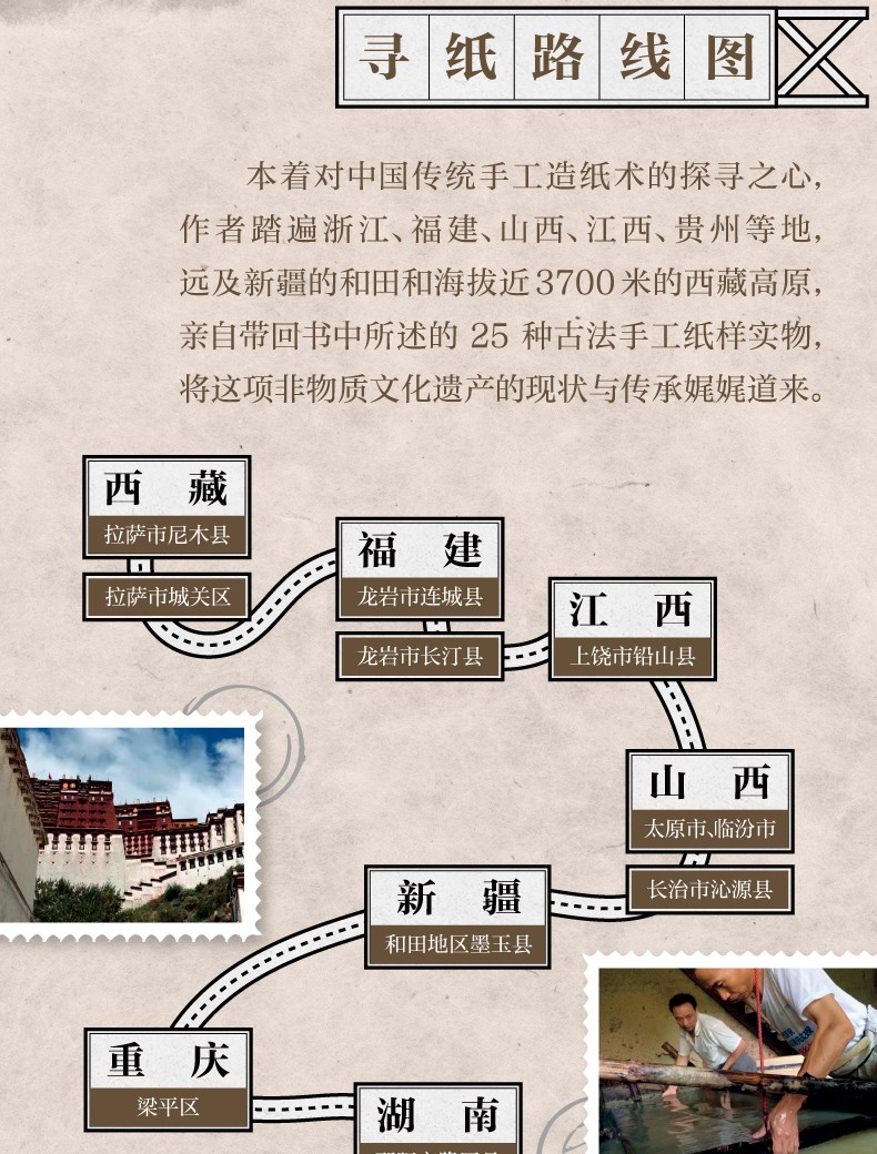 一名古籍修復師歷時七年,尋訪了中國13個省、自治區的全國古法手工造紙地。 她以親身經歷結合專業視角,考察了各地傳統手工造紙技藝及傳承現狀,記錄了「尋紙」過程中的點滴。 字裡行間流露出對探尋手工造紙術孜孜不倦的堅持,勾勒出一幅當代中國傳統手工紙製造業的現實畫卷。 冥冥之中的責任感、使命感不僅讓她與紙結緣,也驅使她開始現場考察古法手工紙誕生地的深入研究之旅。 本著對中國傳統手工造紙術的探尋之心,作者踏遍浙江、福建、山西、江西、貴州等十三個省自治區,遠及新疆的和田和海拔近3700公尺的西藏高原,親自帶回 書中所述的25種古法手工紙樣實物,將這項非物質文化遺產的現狀與傳承訓蓢道來。