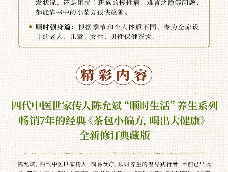 順時強身篇:共有75個保健茶方,根據季節和個人體質不同,專為全家設計的老人、兒童、女性、男性保健茶飲。