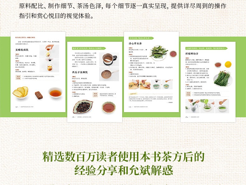 專業攝影團隊歷時15天實景拍攝,從上萬張高清圖中精選500幅精品彩圖。茶方原料配比、製作細節、茶湯色澤,每個細節逐一真實呈現,提供詳盡周到的操作指引和賞心悅目的視覺體驗。