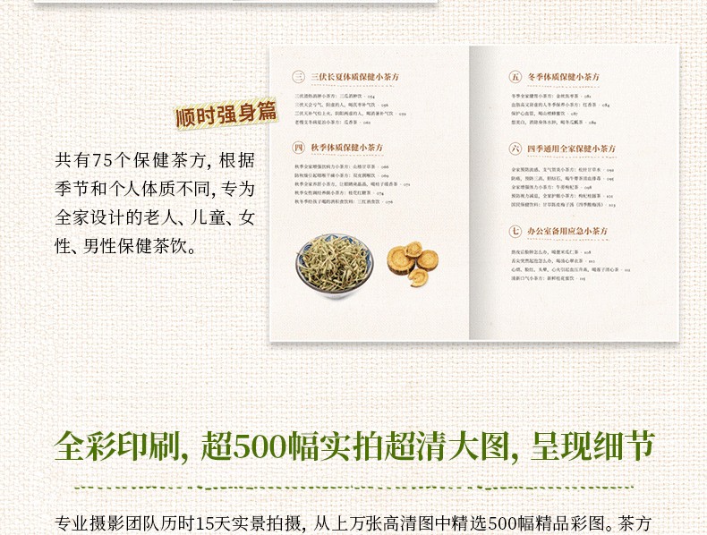 “順時強身篇”共有75個保健茶方,除了適合全家人四季通用的保健小茶方,以及針對春、夏、秋、冬每個季節的順時飲方,還有適合老人、女性和兒童、男性不同身體狀況的保養茶方。