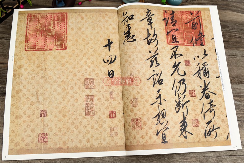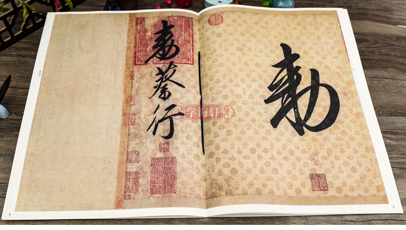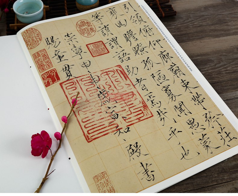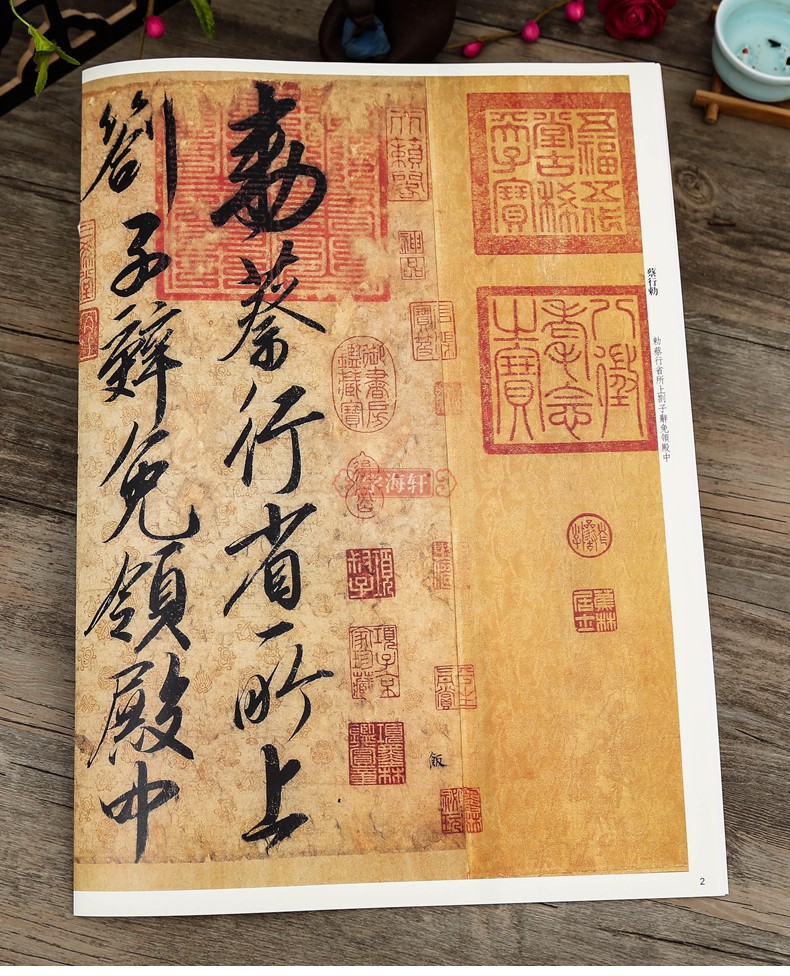 本書收宋徽宗真書"閏中秋月詩帖"、"夏日詩帖"、"牡丹詩帖"、"怪石詩帖"、"棣棠花詩帖"、"筍石詩帖"、"欲借、風霜二詩帖"、"祥龍石圖自題"、"李太白書上陽台帖跋"、"歐陽詢書張翰帖跋"等九件墨跡。 "閏中秋月詩帖"縱三十五厘米,橫四十四點五厘米。 "夏日詩帖"縱三十四厘米,橫四十四點五厘米。 "牡丹詩帖"縱三十四點八厘米,橫五十三點三厘米。 "怪石詩帖"縱三十四點四厘米,橫四十二點二厘米。 "棣棠花詩帖"與"筍石詩帖"合為一件,其縱四十五厘米,橫五十厘米。 "欲借、風霜二詩帖"縱三十三點二厘米,橫六十三厘米。 "祥龍石圖自題"縱五十三點八厘米,"李太白書上陽台帖跋"縱二十八點五厘米,"歐陽詢書張翰帖跋"縱二十五點二厘米。 "牡丹詩帖"和"欲借、風霜二詩帖"藏於台北故宮博物院,其餘均藏於故宮博物院。