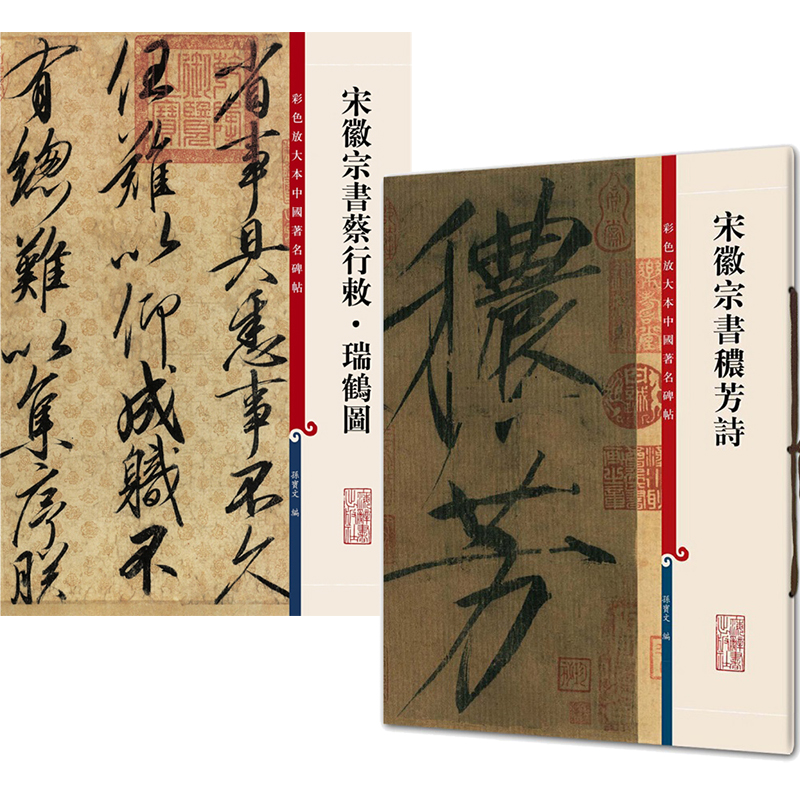 "彩色放大本中國碑帖"系列,底本好,印製精,大8開,為彩色放大本,並延請專家釋文,方便讀者研究學習,尤其適合書法愛好者對帖臨摹。本書為"彩色放大本中國碑帖"系列之一。 "在遼寧省博物館,藏有兩件宋徽宗趙佶珍跡。其行書蔡行敕卷,縱三十五點五厘米,橫二百一十四點六厘米。方家評說,這卷珍跡行間佈白疏朗得體,筆劃纖細,墨韻流暢,瀟灑清勁,有如飄藤盪柳之勢。另一卷是《瑞鶴圖》,此作書畫合璧,絹本,縱五十一厘米,橫一百三十八厘米。有方家稱道,其繪畫技法尤為精妙,圖中群鶴如雲似霧,姿態百變,無有同者。卷後瘦金書健筆開張,挺勁爽利,側峰如蘭竹,媚麗之氣溢出字裡行間。在上海博物館,藏有一件宋徽宗草書七言詩聯團扇,絹地,直徑二十八點四厘米。在台北故宮博物院,藏有一件《宋徽宗文會圖》,圖上有宋徽宗題寫的七言絕句。編者將上述四件珍跡略微放大印出,供廣大讀者欣賞、臨習。
