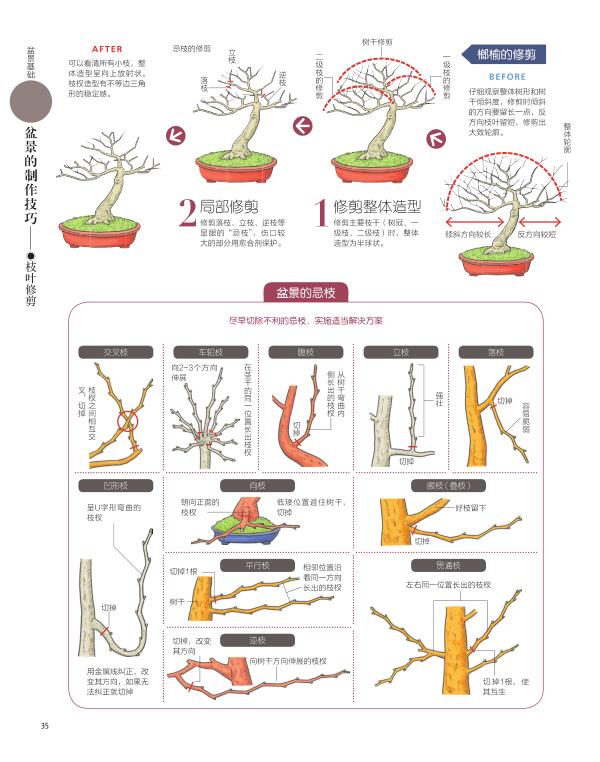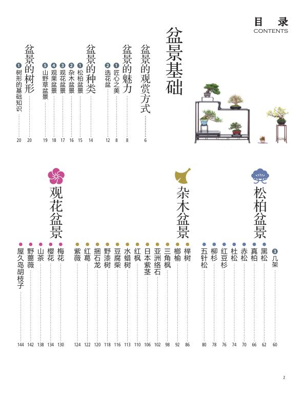 全書介紹了盆景的基礎知識,包括普通盆栽與盆景的差異,盆景的種類,盆景的基本樹形,製作盆景的工具,使用的盆土、盆器與幾架,盆景的陳設方法;盆景的基礎管理與養護方法,包括放置地點、澆水、施肥、防治病蟲害,移栽準備與方法,鋪種苔蘚,覆蓋盆土,蟠扎,養護,繁殖等;常見樹木盆景製作方法,包括松柏類、雜木類、觀花類、觀果類、草本類等74種備受追捧的盆景作品步驟圖解。