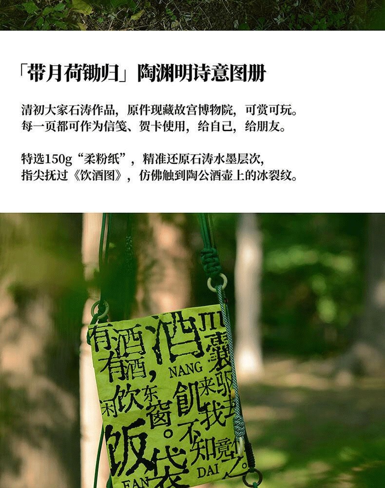 為故宮藏畫復刻,可欣賞可收藏。陶淵明筆下「桑竹垂餘蔭,菽稷隨時藝」的豐饒景象,在石濤墨筆下化作疏淡筆觸;「童孺縱行歌,班白歡遊詣」的淳樸場景,成了畫中老幼相攜的暖意。你甚至可以裁下畫頁作信箋,寄給摯友,並附上:「久在樊籠裡,一同返自然」。