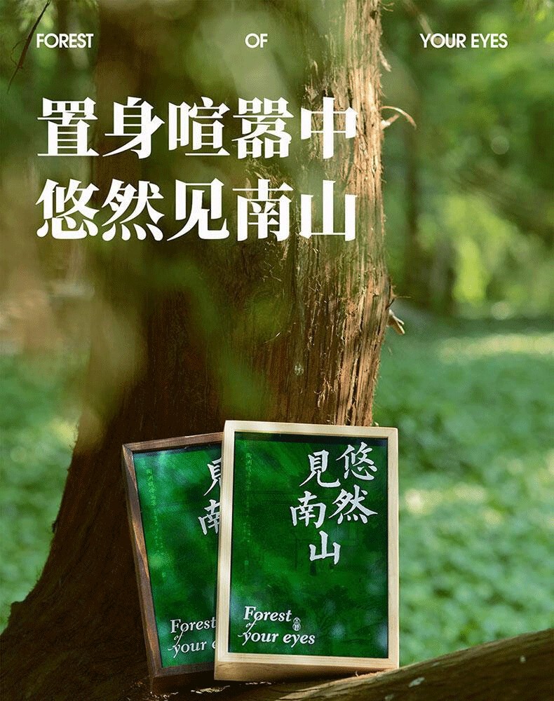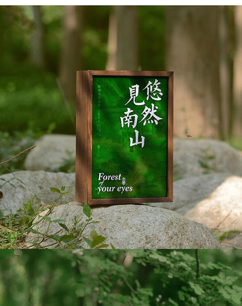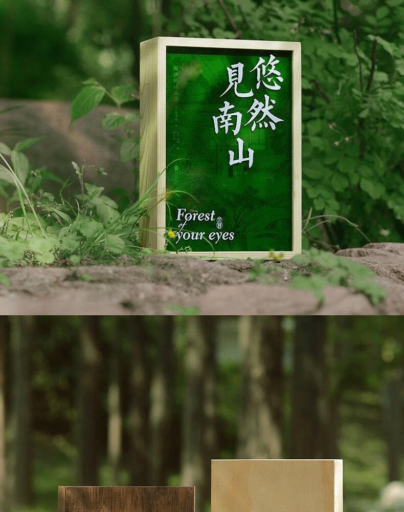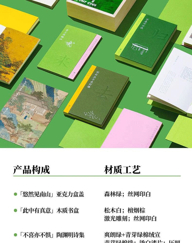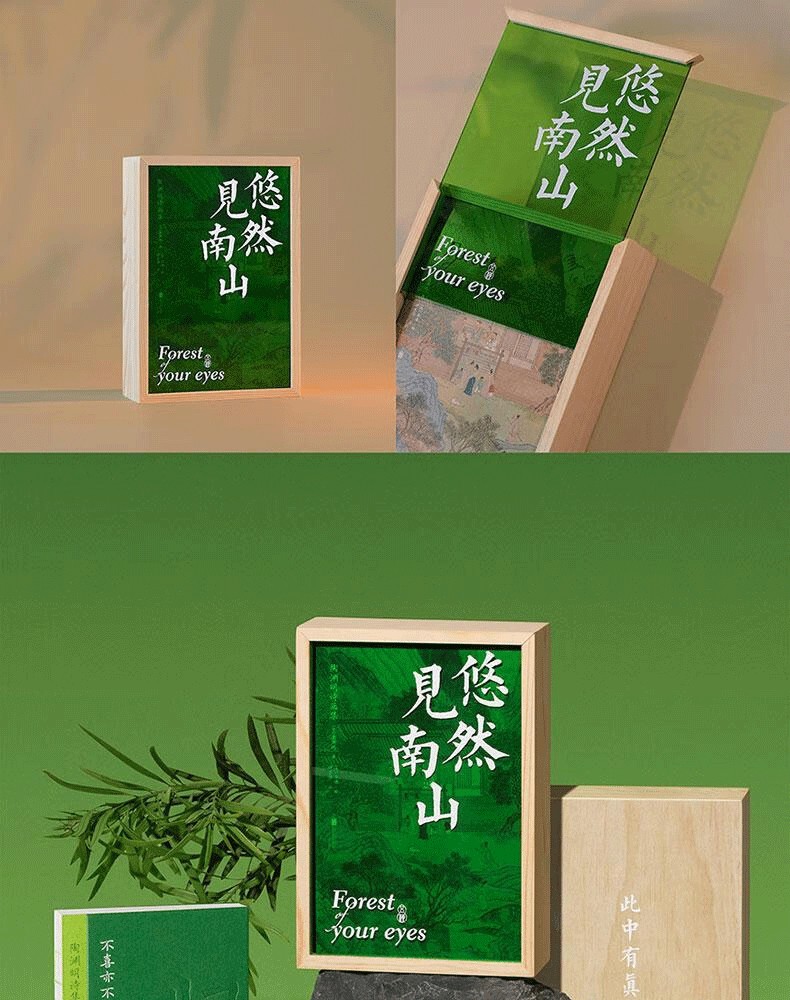 森林綠的壓克力盒蓋如同青山上的薄霧,明代仇英的《桃花源圖》若隱若現,如武陵人初見山口微光。抽拉盒蓋+手工雕刻木盒,還原「初極狹,才通人」的桃源入口感,拉開盒蓋,三冊書從淺碧到墨綠,層層疊疊展現出田園的生機與活力。