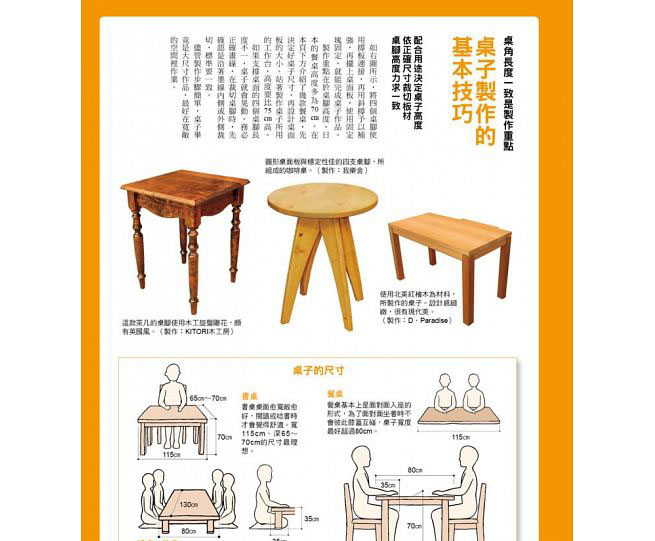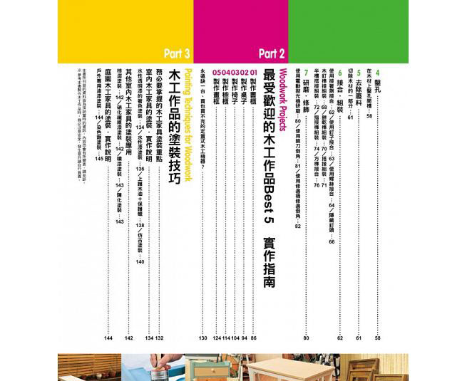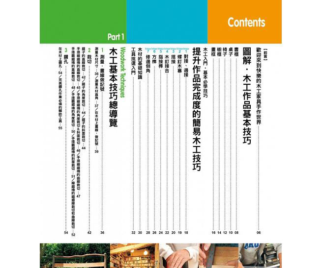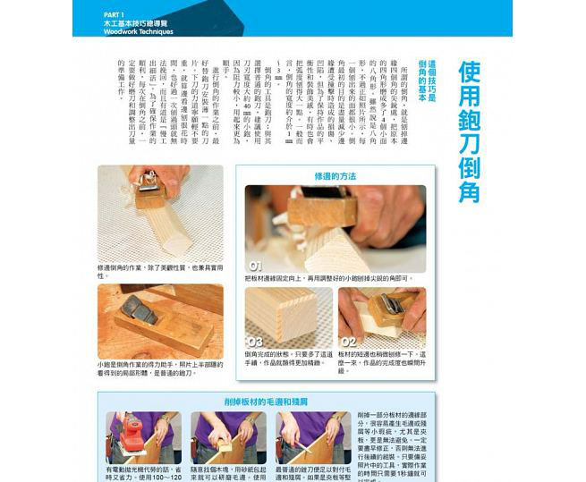 一無所知也不怕,從常用的木材介紹&如何挑選工具開始,再切入基本組裝及表面修飾的概念講解。用極具份量的頁數和圖片,詳述一件木工作品從頭到尾的製作過程。