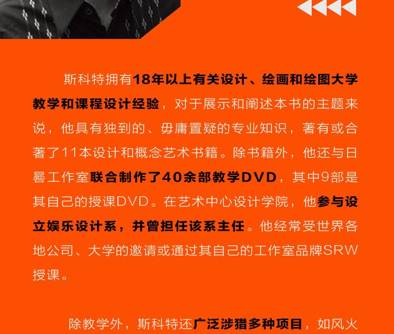 斯科特?羅伯森斯科特?羅伯森擁有20年以上關於設計、繪畫、繪圖以及大學教學和課程設計經驗,對於展示和闡述本書的主題來說, 他具有獨到的、毋庸置疑的專業知識。斯科特已出版了11本設計和概念藝術書籍,還與“日晷工作室”聯合製作了40餘部教學DVD,其中9部是自己授課的DVD。在藝術中心設計學院,他參與設立娛樂設計系,並曾擔任該系主任。他經常受世界各地公司、大學的邀請或通過自己的工作室品牌SRW 授課。
