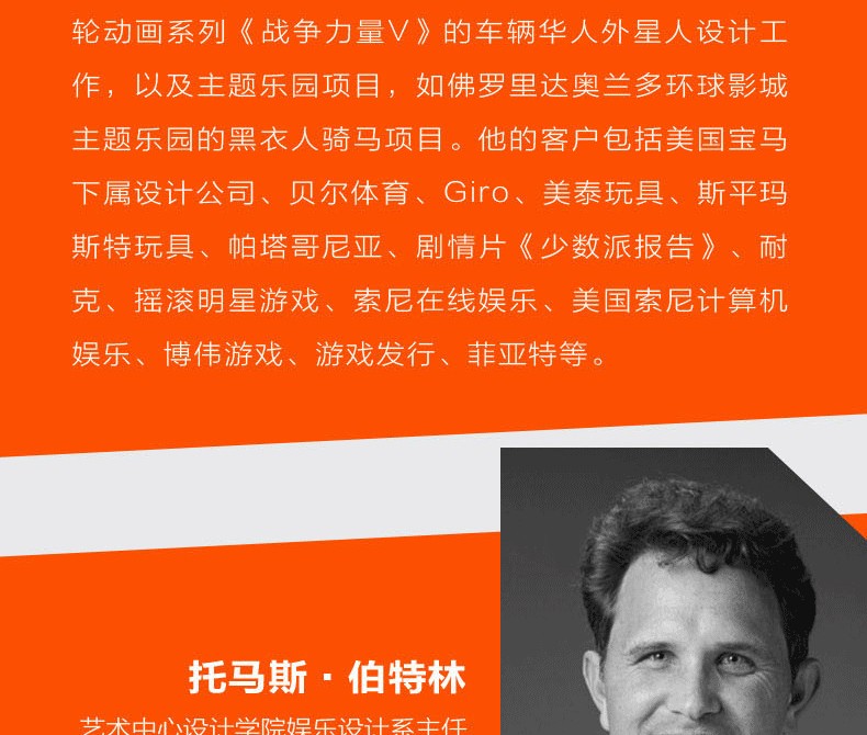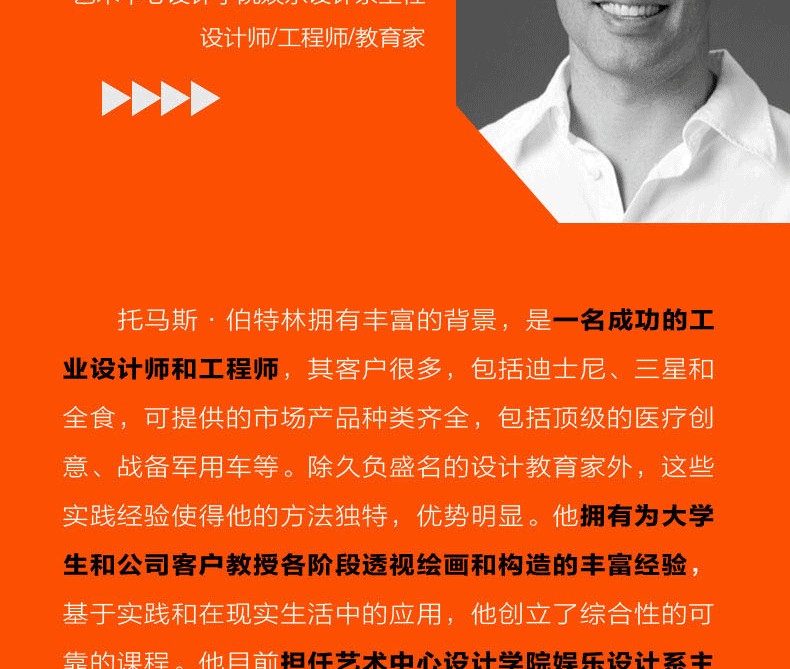 托馬斯?伯特利托馬斯?伯特林擁有豐富的行業背景,是一名成功的工業設計師和工程師,其客戶眾多,包括迪士尼、三星和全食,可提供設計領域覆蓋全行業的類型,甚至包括 的醫療產品、戰備軍用車等。托馬斯不僅是一個 的設計師同時也是一位廣受讚譽的設計教育家。這些項目在為他提供實踐性專業知識的同時,還為他提供了獨特的教學方法和 的設計優勢。他擁有向各個層次大學生和企業客戶教授透視草圖技法和構建技巧的豐富教學經驗,創建了 完善且紮根於實用性和實踐應用的工業設計綜合課程。他目前擔任藝術中心設計學院娛樂設計系主任,同時教授多門課程,並負責師資培訓。