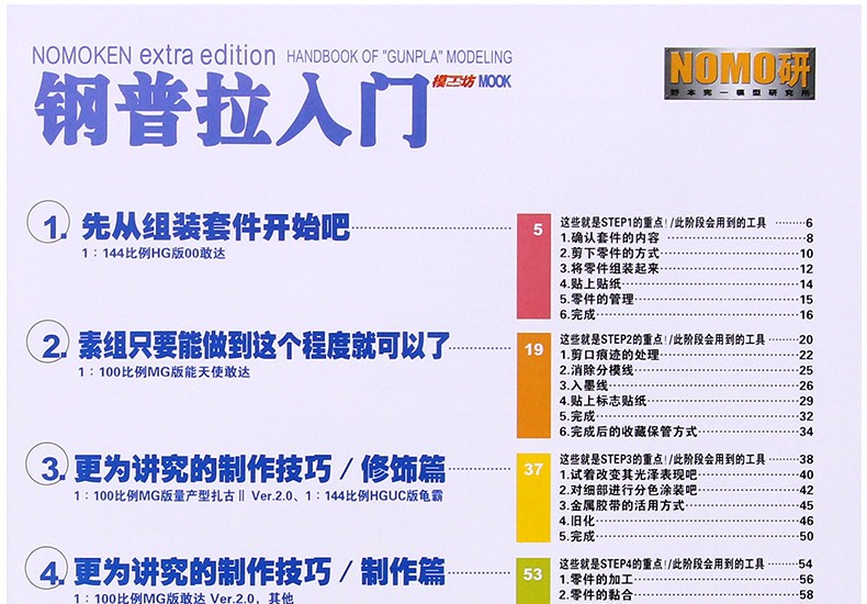 人級模型製作大師野本憲一傾情製作《鋼普拉入門》,這是一本製作過程詳盡的鋼普拉製作入門圖書,野本憲一先生不僅用自己細膩的製作手法展現了自己的模型製作技術和技巧,更加詳細的為製作工具摸不著頭腦的玩家們詳細的介紹了每篇教程所使用的工具,以及如何使用。此書在日本一經推出,立即受到了模型迷們的熱捧。